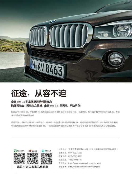 即日起至9月30日,全新BMW X5購車優(yōu)惠活動(dòng)將在BMW武漢中達(dá)江寶開展。在此期間,購車客戶將享受多重專屬禮遇,尊榮備至讓您的征途愈顯從容!