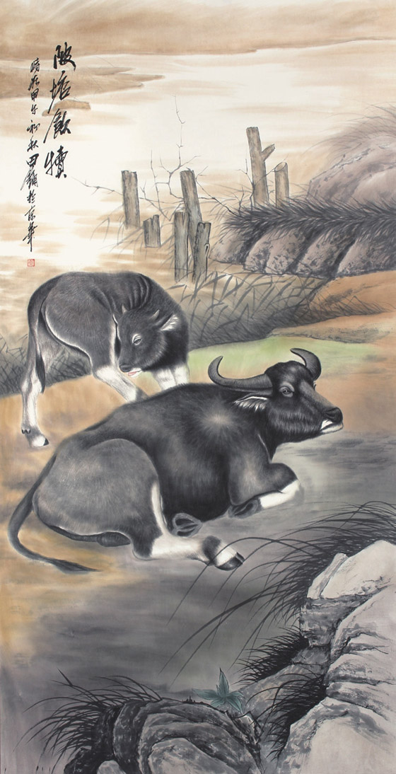 田庸   坡塘飲犢    136x68cm